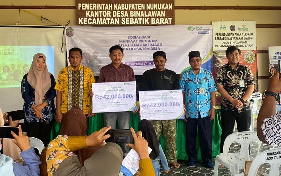 NUNUKAN — BPJS Ketenagakerjaan Kantor Cabang Nunukan menyerahkan santunan manfaat Program Jaminan Kematian (JKM) kepada ahli waris peserta kategori pekerja rentan desa di Desa Binalawan, Kecamatan Sebatik, Kabupaten Nunukan. Penyerahan dilakukan secara langsung sebagai bentuk komitmen negara dalam menghadirkan perlindungan sosial ketenagakerjaan hingga ke wilayah perbatasan.